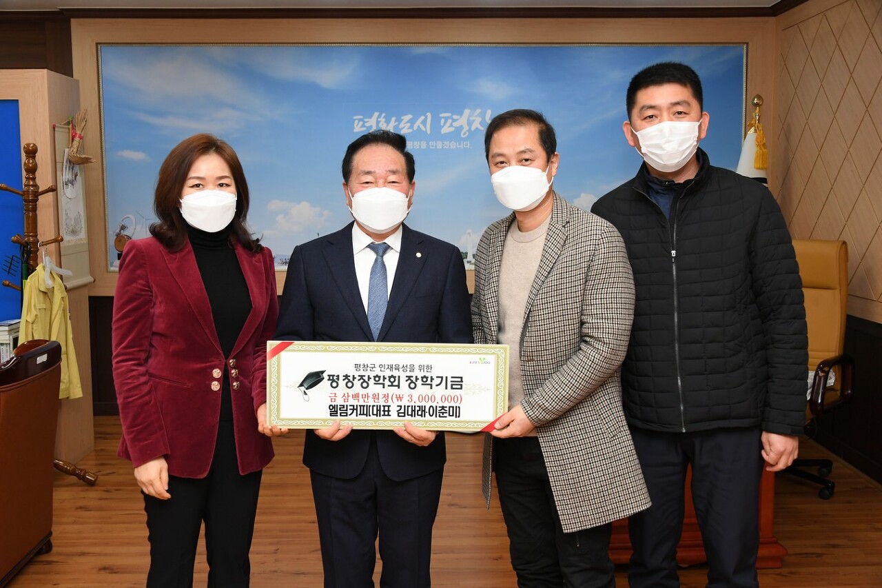 엘림커피(대표 김대래)가 31일 평창군청에서 평창장학회에 장학기금 3백만 원을 기탁하였다.