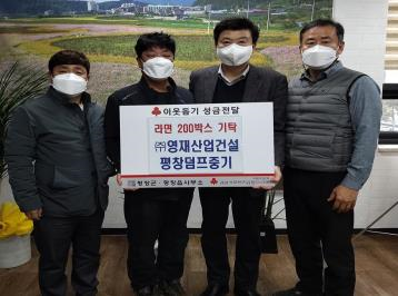○ 어제(1.24.) ㈜영재산업건설(대표 김영국)과 평창덤프중기(대표 한두용)는 어려운 이웃을 위해 사용해 달라며 평창읍(라면 200박스)과 방림면(라면 150박스)에 이웃돕기 물품을 기탁하였음.