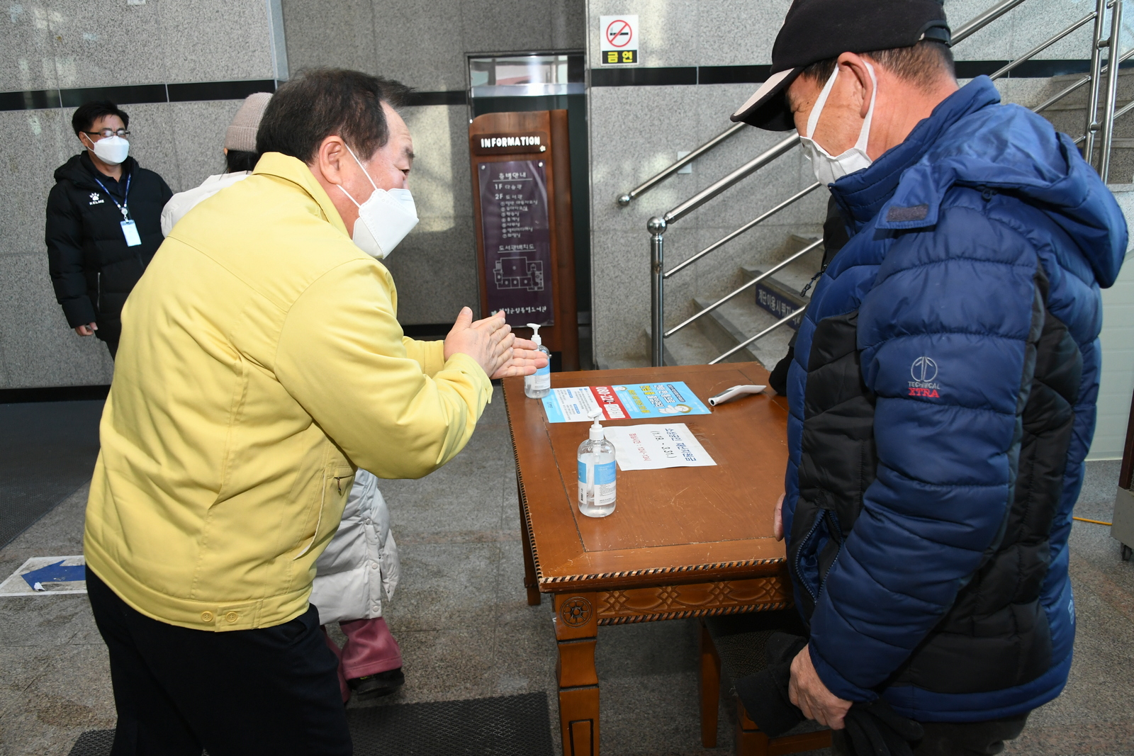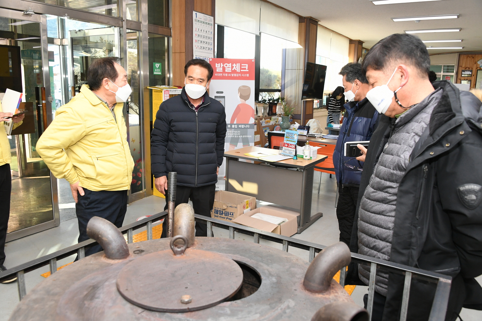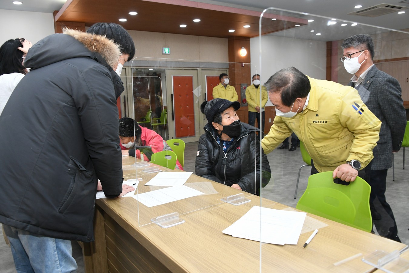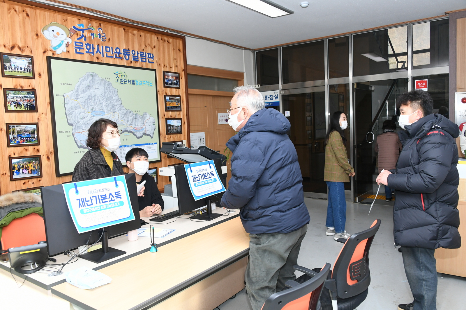 20일 한왕기 평창군수가 지난 19일부터 시작된 평창군 재난기본소득 및 소상공인 재난지원금 지급 읍면 창구를 찾아 현장 점검 및 전담 직원들을 격려하는 한편 신속한 지원금 지급을 독려하고 있다.