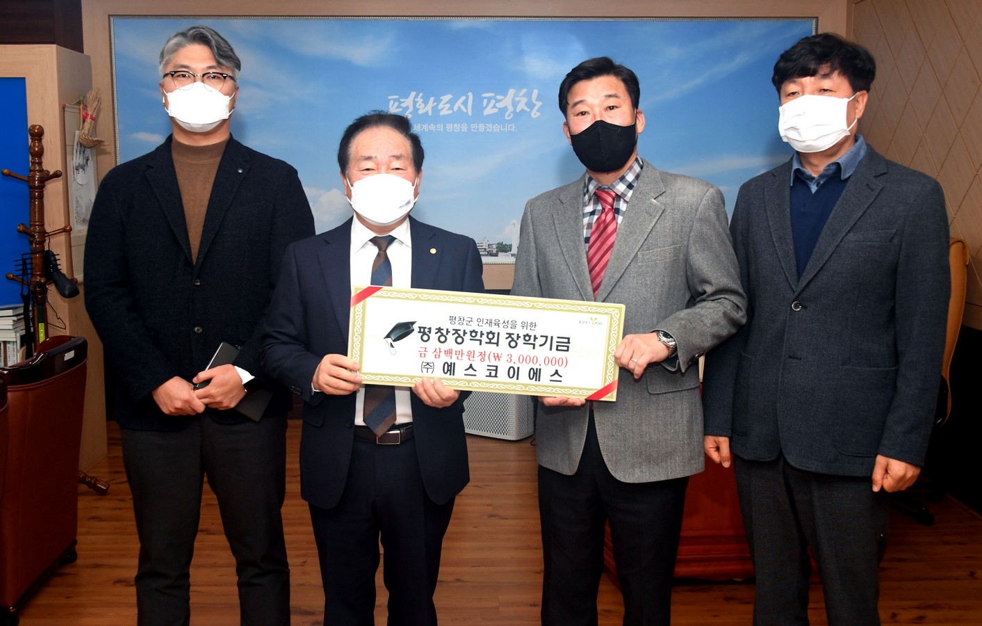 평창장학회는 ㈜예스코이에스(대표 김상헌)가 21일 평창군청을 방문하여 장학금 3백만 원을 기탁했다고 밝혔다.