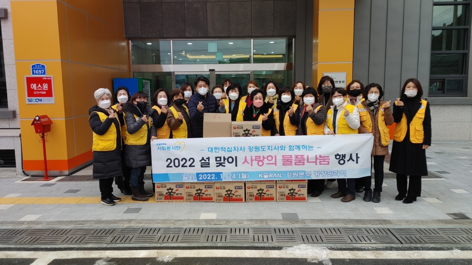 이날 설맞이 나눔활동 행사에서는 평창관리역 봉사회가 대한적십자사 강원도지사 평창지회와 함께 50만원 상당의 라면 등 식료품을 평창군 취약계층 10가구에 기부하였다.