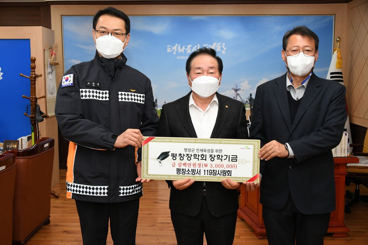 평창소방서 119참사랑회(회장 오창훈)가 11일(금) 평창군청을 방문하여 평창장학회에 장학금 3백만 원을 기탁했다.