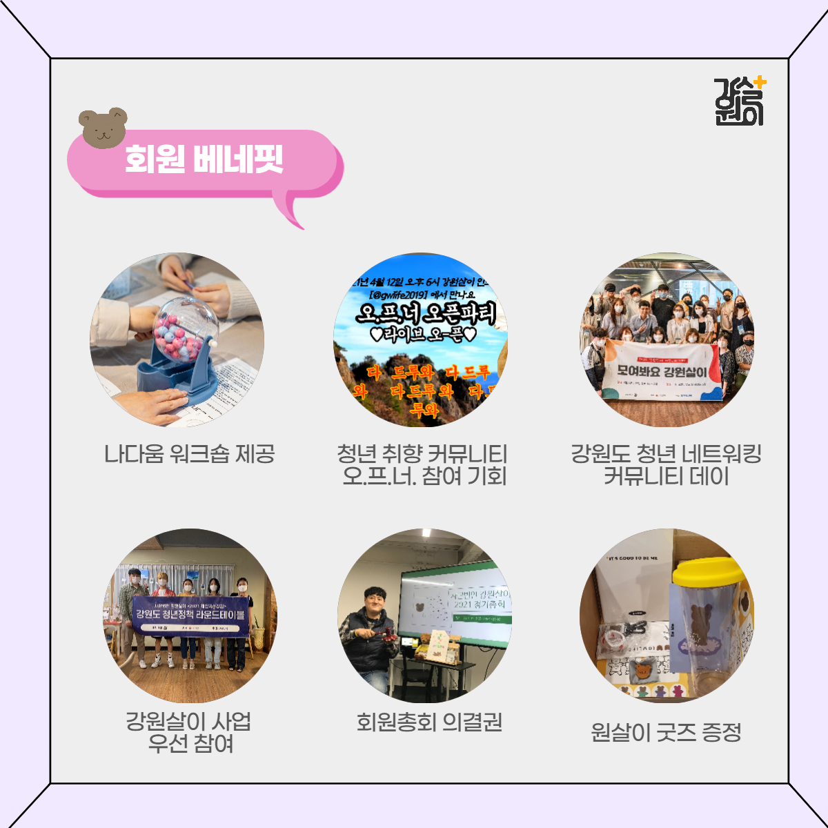 회원이 될 경우에는 나다움 워크숍 제공, 청년 취향 커뮤니티 오.프.너 참여 기회, 강원도 청년 네트워킹 커뮤니티 데이, 강원살이 사업 우선 참여, 회원총회 의결권, 원살이 굿즈 증정 등의 혜택을 받을 수 있다.