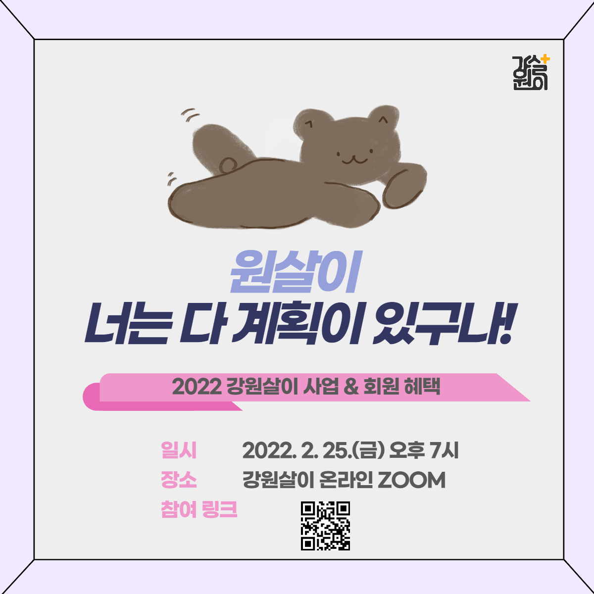 『2022 사단법인 강원살이 사업설명회』는 코로나19 확산방지 및 예방차원에서 사업설명회를 [온라인]으로 진행하게 되었다고 밝혔다. 진행은 2022. 02. 25(금) 19시이며, 비대면(ZOOM)으로 진행한다. 참여방법은 다음의 참여신청서를 작성하면 된다. https://bit.ly/3sRaplf