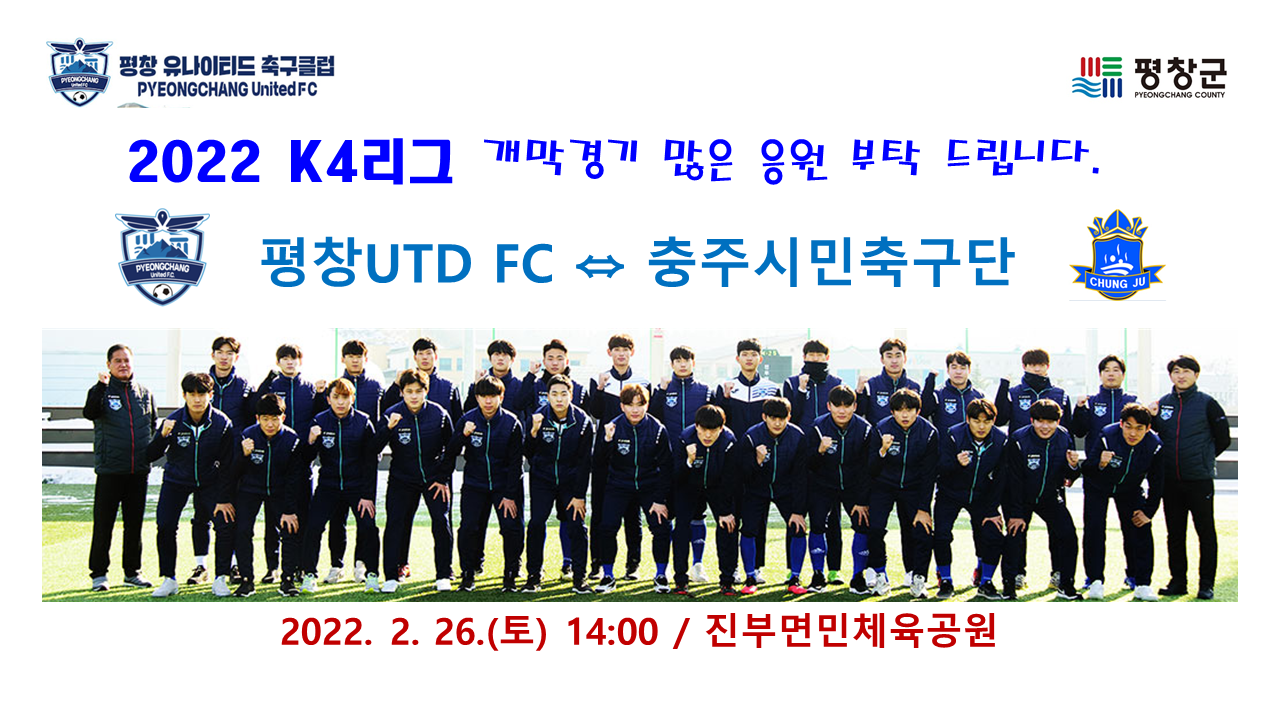 평창군 지역연고 축구단인 평창유나이티드 FC(단장 심봉섭)2022 K4리그 34라운드 첫 홈 개막전(충주 시민축구단)226일 오후 2시 진부면민체육공원에서 열린다.