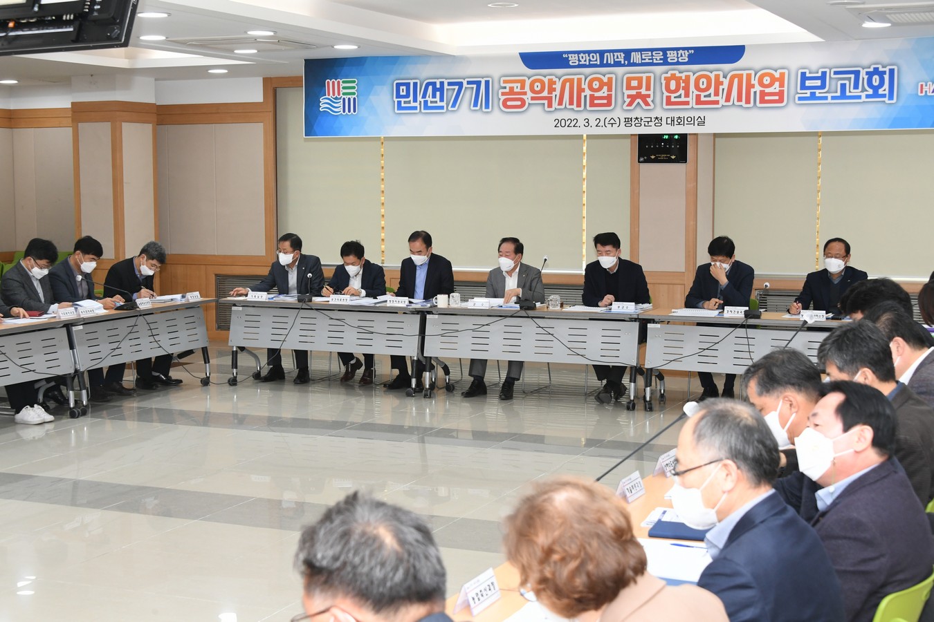 군은 민선7기 공약사업으로 “평화”, “문화관광”, “농림축산”, “지역경제”, “복지” 5대 분야의 20개 이행과제를 선정하고 54개의 세부사업을 추진하고 있는데, 2022년 1분기 현재 공약 이행률은 54개 사업 중 52개 사업으로 96.2%이며, 이중 완료된 공약사업은 평창평화포럼 개최, 평창형 HOPE 관광매력 거점도시 추진 등 43개 사업으로 79.6%의 완료율을 달성하고 있다.