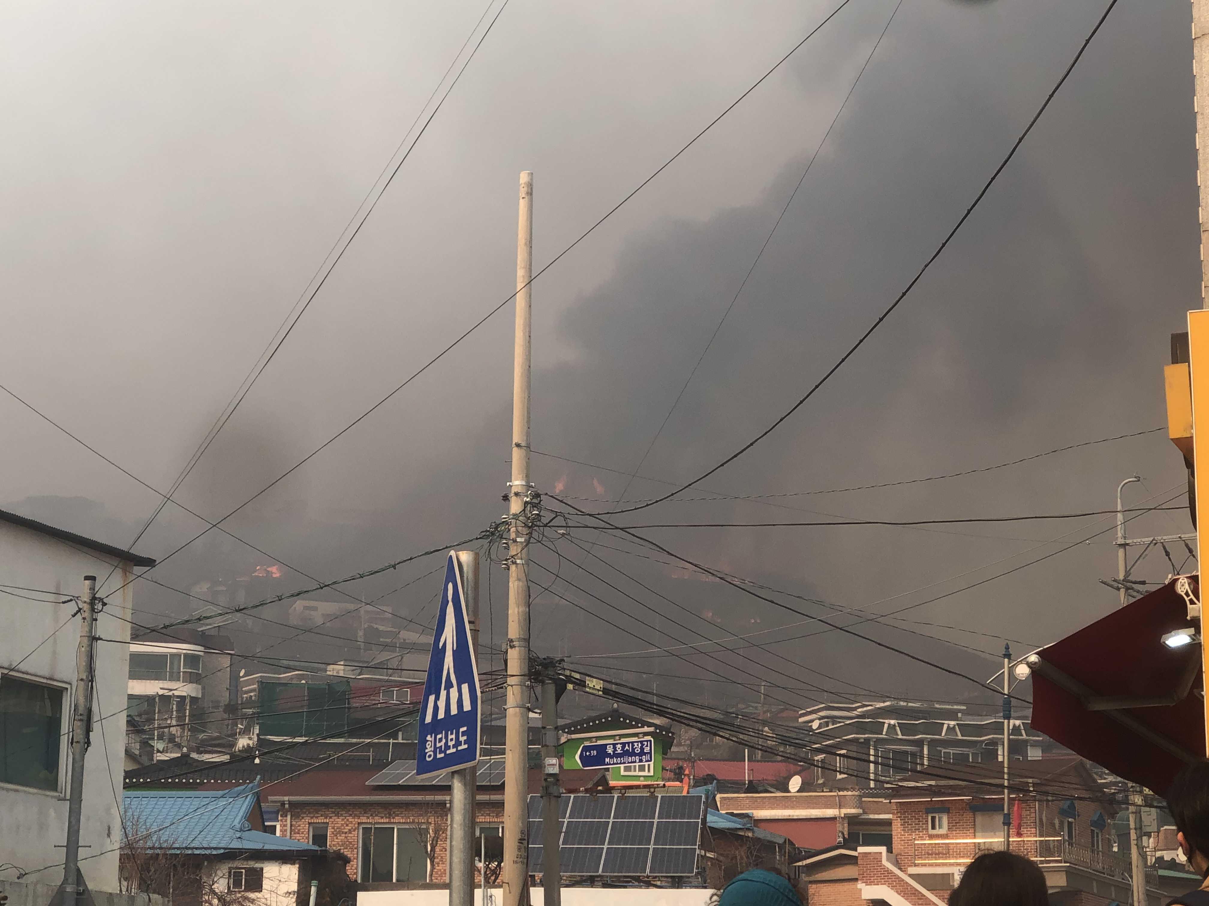 3월5일 옥계에서 발생한 산불이 1:34분 경 동해시 해맞이길 인근 민가로 옮겨붙었으나 진화작업으로 2:50분경 불길이 잦아들고 있다.