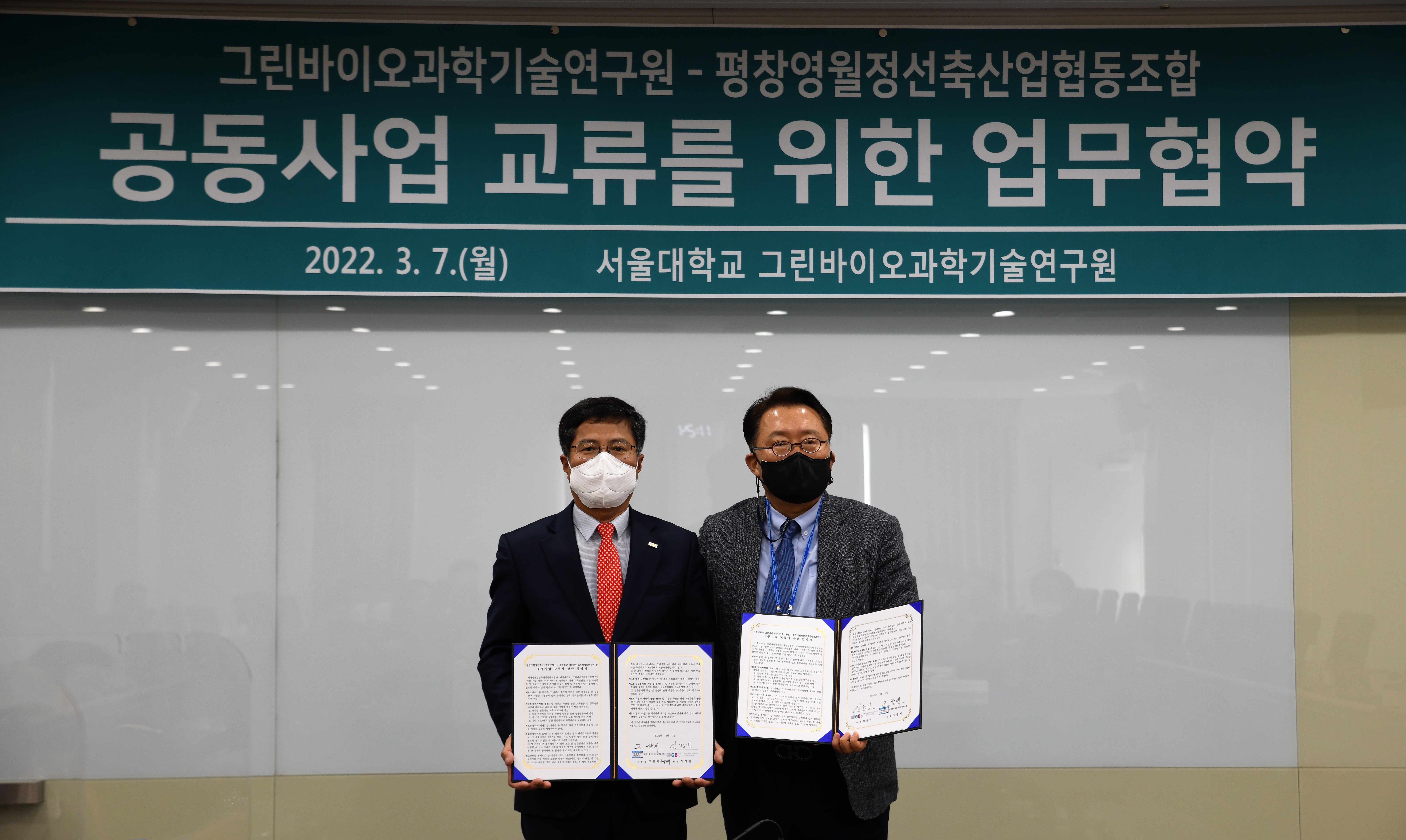 평창영월정선축협(조합장 고광배)는 3월 7일(월) 11시 서울대학교 그린바이오과학기술연구원 2층 대회의실에서 서울대학교 그린바이오과학기술연구원(원장 임정빈)과 공동사업교류를 위한 업무협약(MOU)을 체결했다.