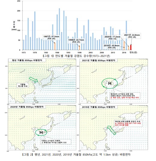 최근 10년 중 겨울철 강수량이 가장 적었던 해와 많았던 해를 비교하면 최근 겨울철 강수량이 적었던 해(2020년/17.2 mm/하위 1위)에는 올해처럼 고기압의 영향을 주로 받아 강수량이 평년보다 적었고, 강수량이 많았던 해(2019년/ 148.9 mm/ 상위 9위)에는 고기압 가장자리를 따라 따뜻한 남풍이 유입되어 강수량이 평년보다 많았다.