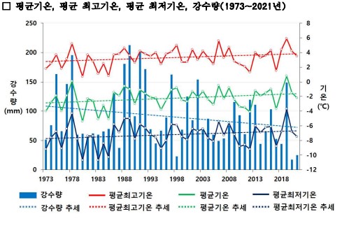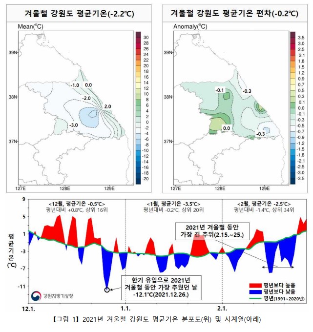 지난 겨울철 동안 강원도 일평균기온 최젓값: -12.1℃(2021.12.26.) - 2월 중·하순에는 중국 북부 ~ 오호츠크해까지 대기 중층에서 폭넓게 찬 공기가 정체한 가운데 북서풍이 강화되어, 지난 겨울철 동안 가장 긴 추위(2022.2.15.~25.)가 이어졌다.
