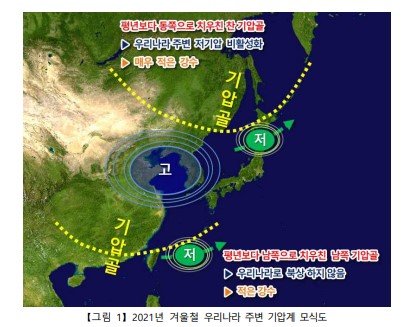 일반적으로 겨울철에는 저기압이 중국이나 서해상에서 생성되어 우리나라를통과하면서 수증기를 공급하고 비를 뿌리지만, 이번 겨울철은 평년보다 기압골이 우리나라 동쪽과 남쪽으로 치우치면서 저기압이 대기 상층 기압골의지원을 받지 못하면서 비나 눈의 양이 많지 않았다.
