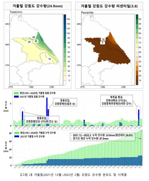 강수량은 2021년 겨울철(2021년 12월 ~ 2022년 2월) 강원도1) 강수량은 24.9 mm (평년 대비 -62.7 mm, 26.0 %에 해당)로 역대(1973년 이후2)) 세 번째로 적었고, 강수일수는 11.8 일(평년 대비 –7.6 일)로 역대 네 번째로 적었다. 특히, 겨울철 동안 강원영서의 강수량은 13.9 mm(평년 대비 –62.0 mm, 20.4 %에해당)로 역대 가장 적었다.