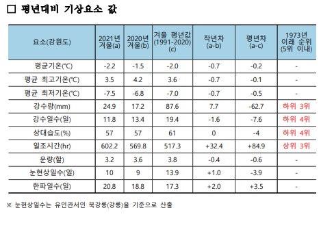 강원지방기상청(청장 박훈)은‘2021년 겨울철 강원도 기후 분석 결과’를발표하였다.
