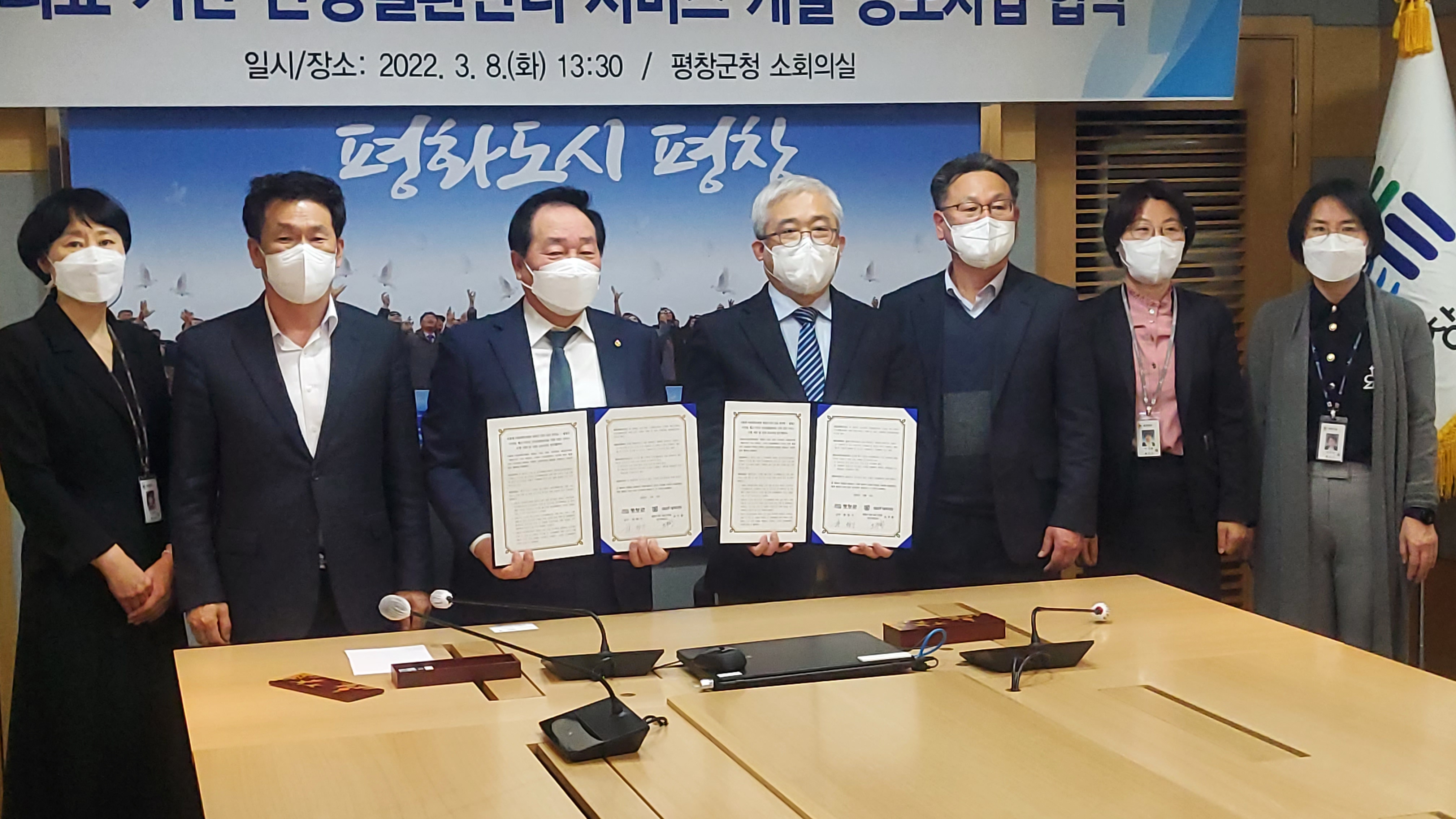 평창군(군수 한왕기)과 '서울대-서울대학교병원 평창군 O2O 실증 연구팀'(연구책임교수 오주환)은 8일 오후, 군 소회의실에서 평창군 지역 주민의 만성질환관리와 건강증진을 위해 한국건강증진개발원이 주관하는 "디지털 헬스기반의 만성질환관리를 위한 O2O 서비스 모델 개발 및 실증" 공모사업을 위한 업무협약을 체결했다.