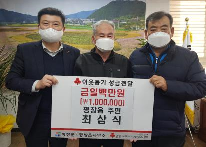 지난(3.8.) 평창읍에 거주하는 최삼식씨(80)가 이번 동해안 산불로 피해를 입은 이재민들에게 전달해 달라며 100만원을 평창읍에 전달하였다. 최삼식씨는 TV를 통해 산불로 집을 잃은 이재민들의 안타까운 사연을 접하고 불우했던 시절 집이 없어 힘들어 했던 기억이 떠올라 이재민들이 어려움을 극복하는데 작은 도움을 주고 싶어 성금을 전달하게 되었다고 말했다.