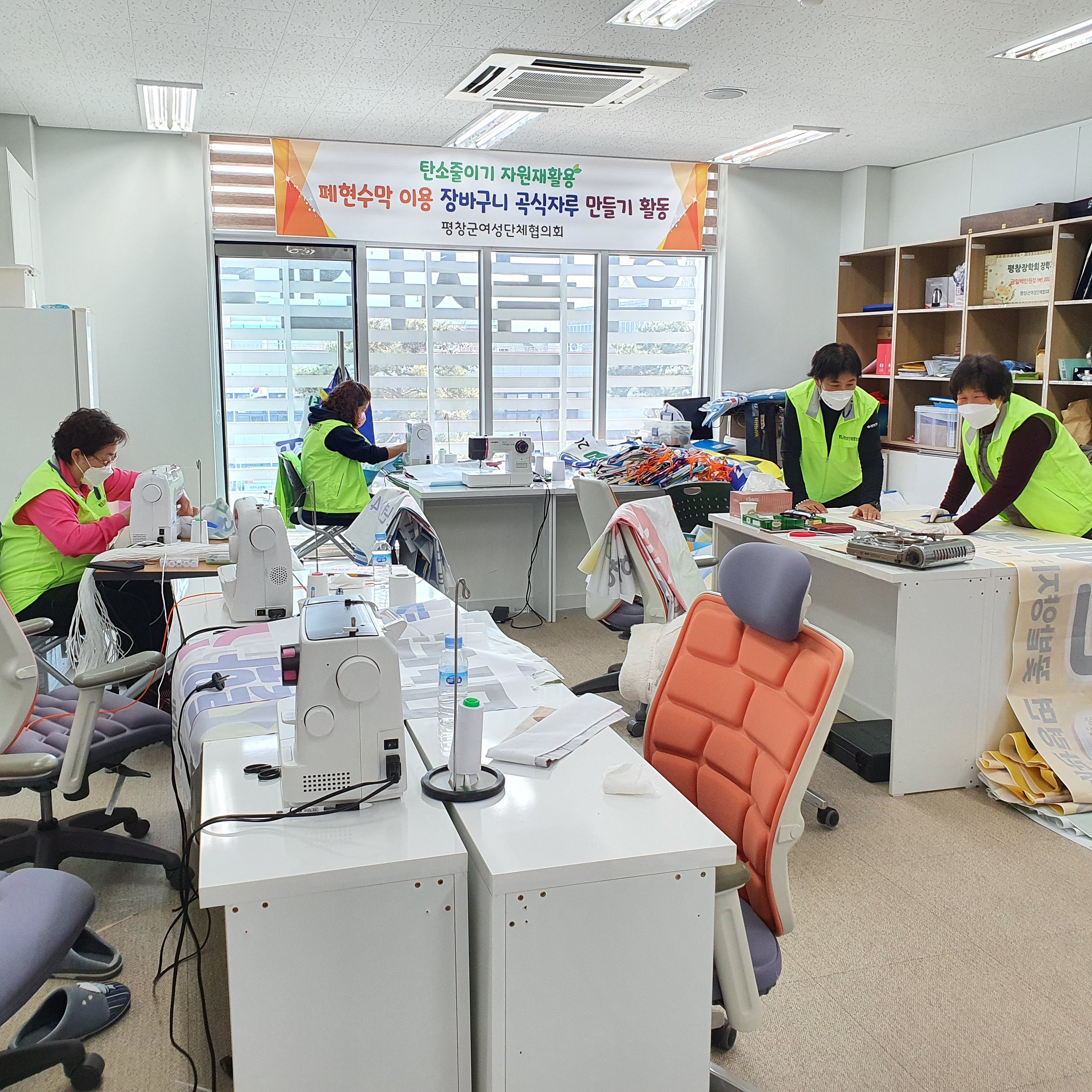 평창군여성단체협의회(회장 김복준)(이하 평창여협)는 지난 2월부터 폐현수막을 활용하여 장바구니와 곡식자루 만들기 봉사 활동을 진행하고 있다.