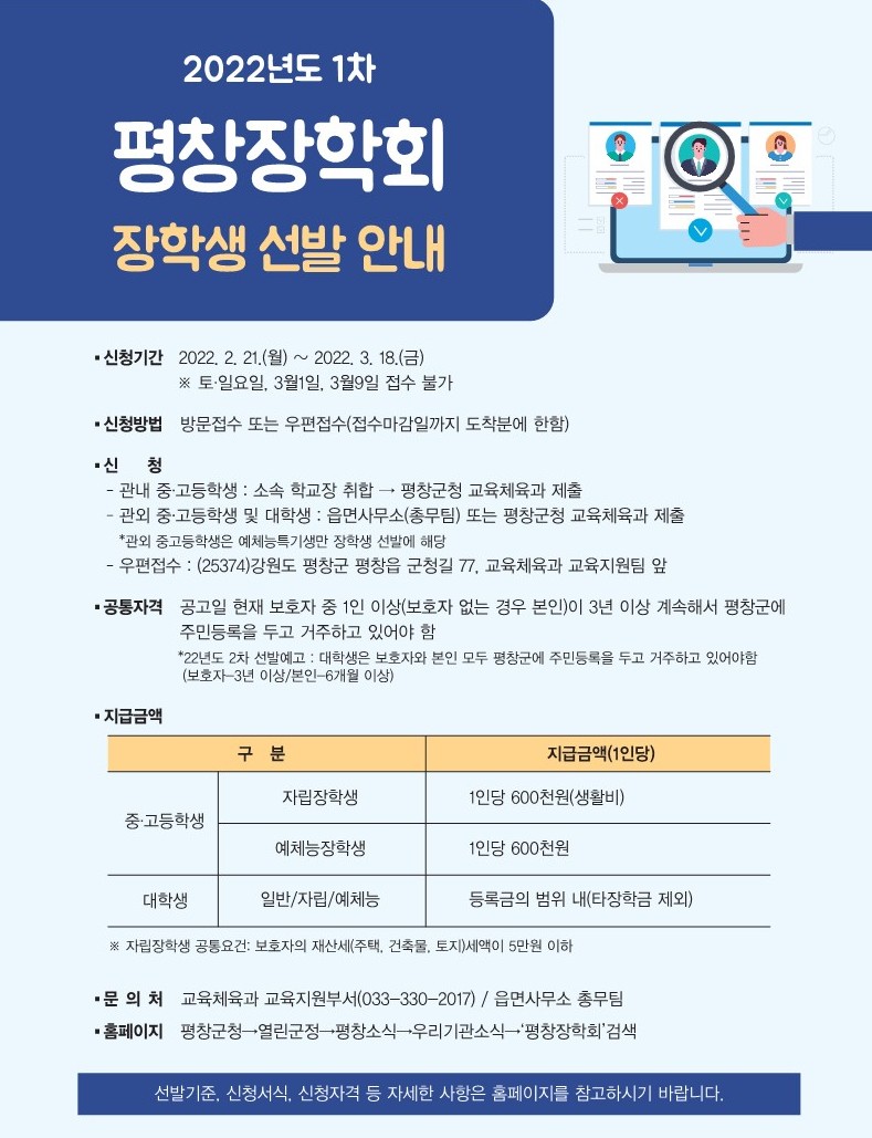 대상은 신입생을 포함한 국내 대학에 재학 중인 학생으로, 공고일 현재 보호자 중 1인 이상이 3년 이상 계속해서 평창군에 주민등록을 두고 실거주하고 있으면 된다. 성적기준은 재학생의 경우 직전학기 평균평점이 4.5만점 기준 2.0이상(자립장학금은 1.0이상)이면 해당되고, 신입생은 내신과 수능성적 기준에 맞춰 유리한 점수를 선택하면 된다.