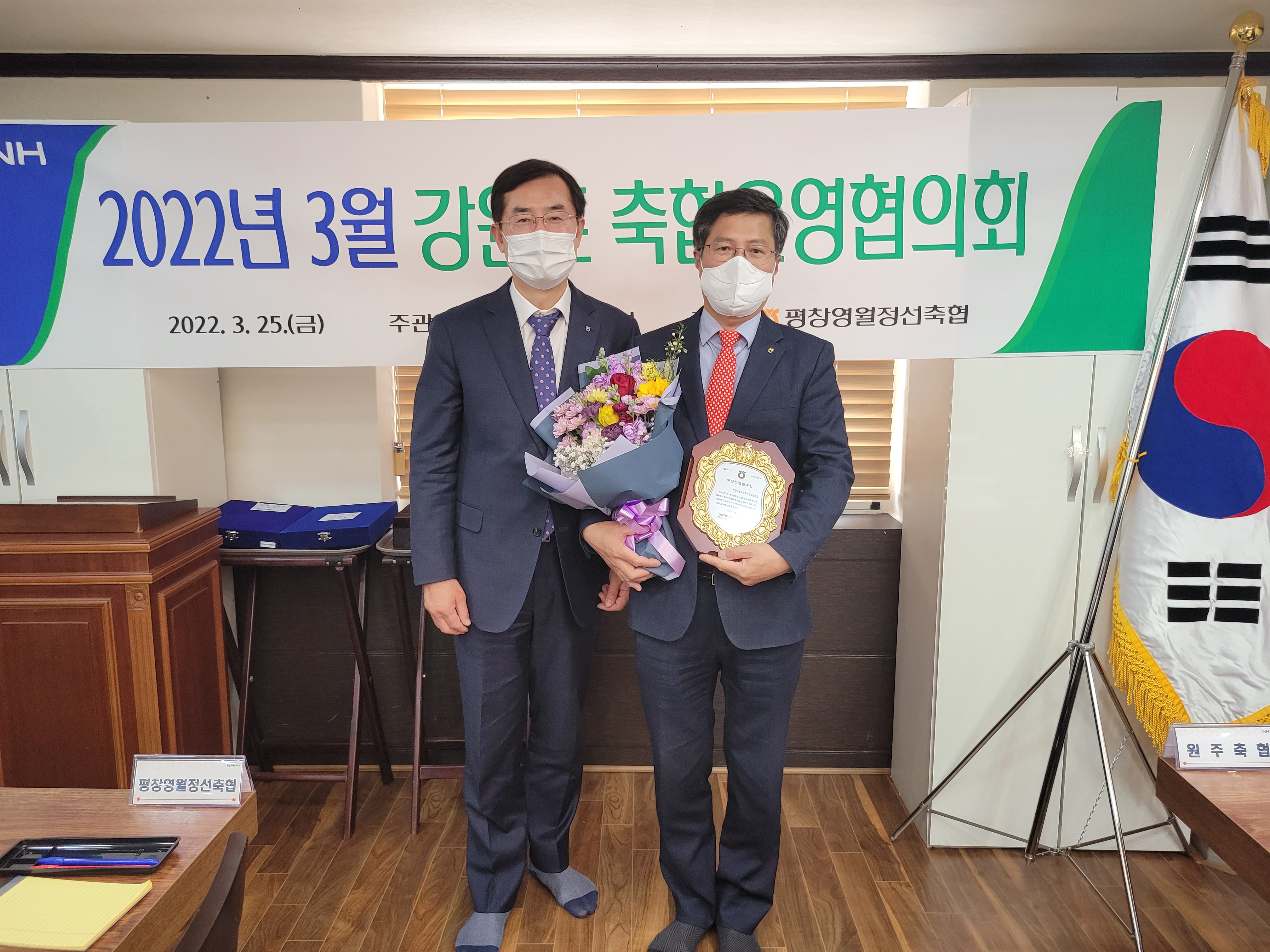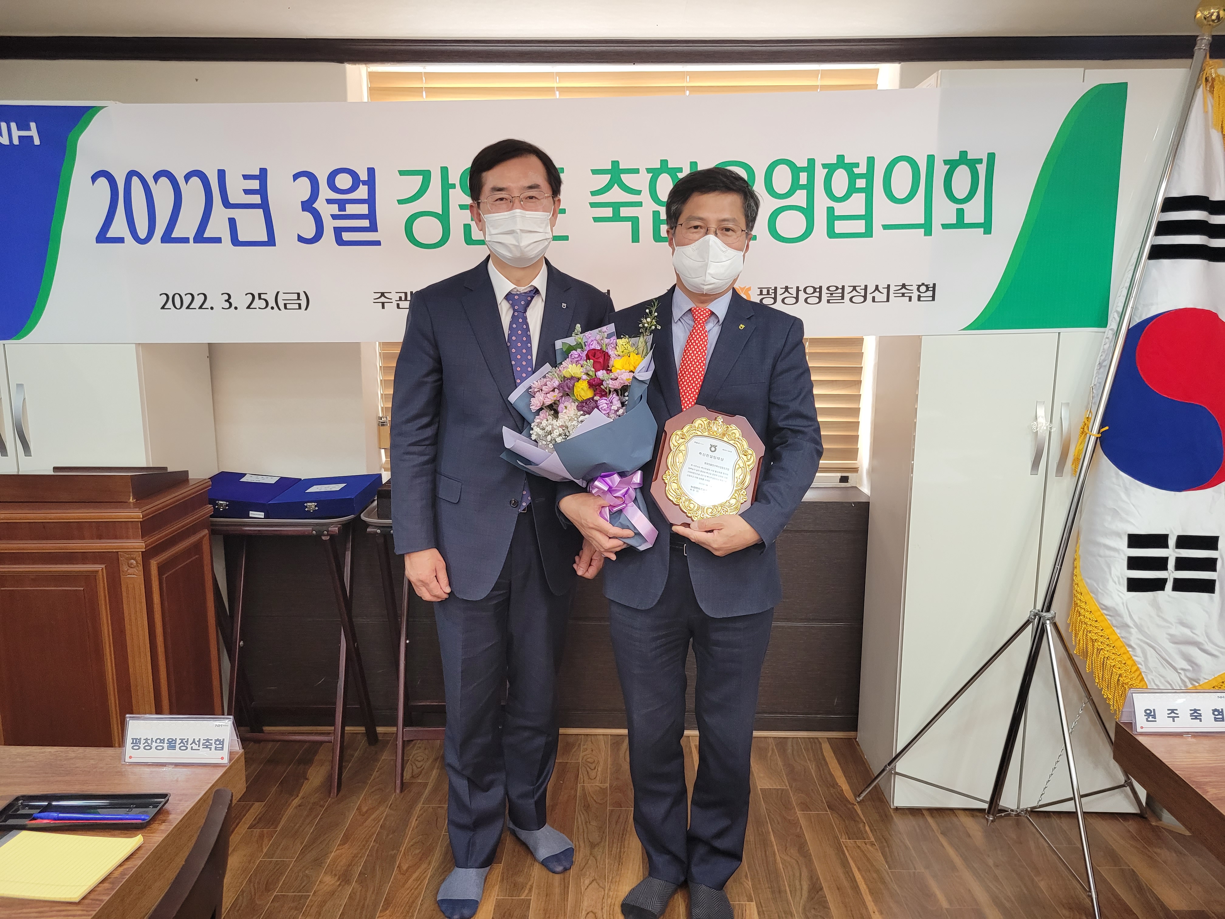 농협강원지역본부(본부장 : 김용욱) 와 강원도축협운영협의회(회장 : 김진만 동삼태축협 조합장)는 평창영월정선축협(조합장 고광배) 대관령한우타운에서 강원도축협조합장협의회를 ‘22.03.25(금) 개최하였으며 2021년 농협중앙회가 실시한 축산경제 부문별 연도대상 축산컨설팅대상을 평창영월정선축협이 수상했다.