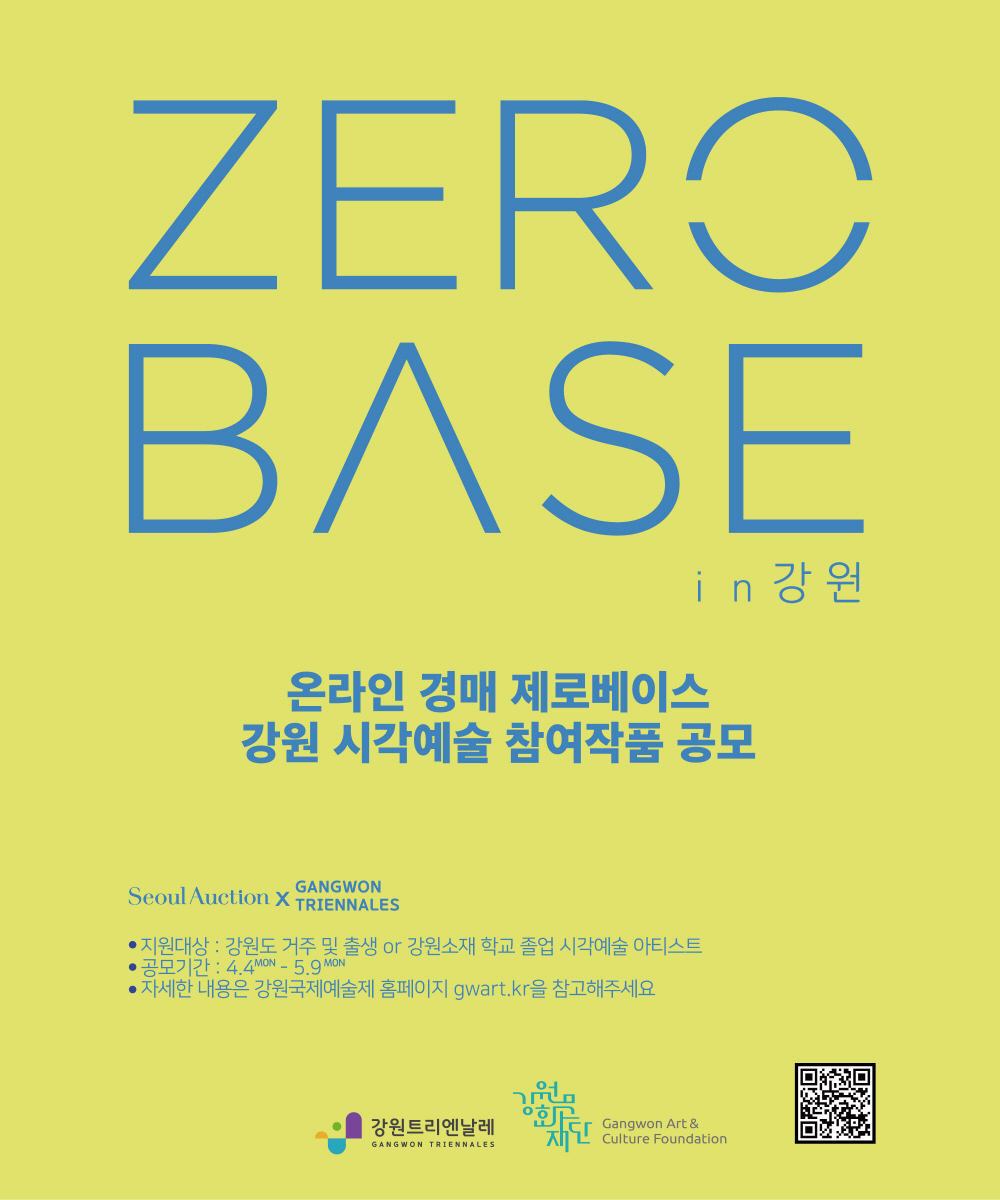 (재)강원문화재단(대표이사 김필국) 강원국제예술제운영실은 서울옥션과 함께 ‘제로베이스×강원트리엔날레’에 참여할 역량 있는 강원도 시각예술 분야 작가를 내달 9일까지 공개 모집한다.